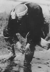 ↑昔の田植えの風景 日本人の特性としてそして遺伝的にも 前傾気味で背中の中心が丸くなっている方が多いです。